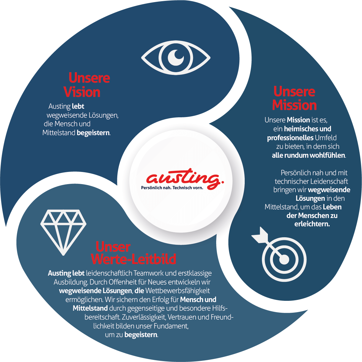 Wir haben im November 2024 gemeinsam mit allen Mitarbeitern unser Leitbild überarbeitet und eine zukunftsgerichtete Vision, Mission und ein finales Werte-Leitbild entwickelt.