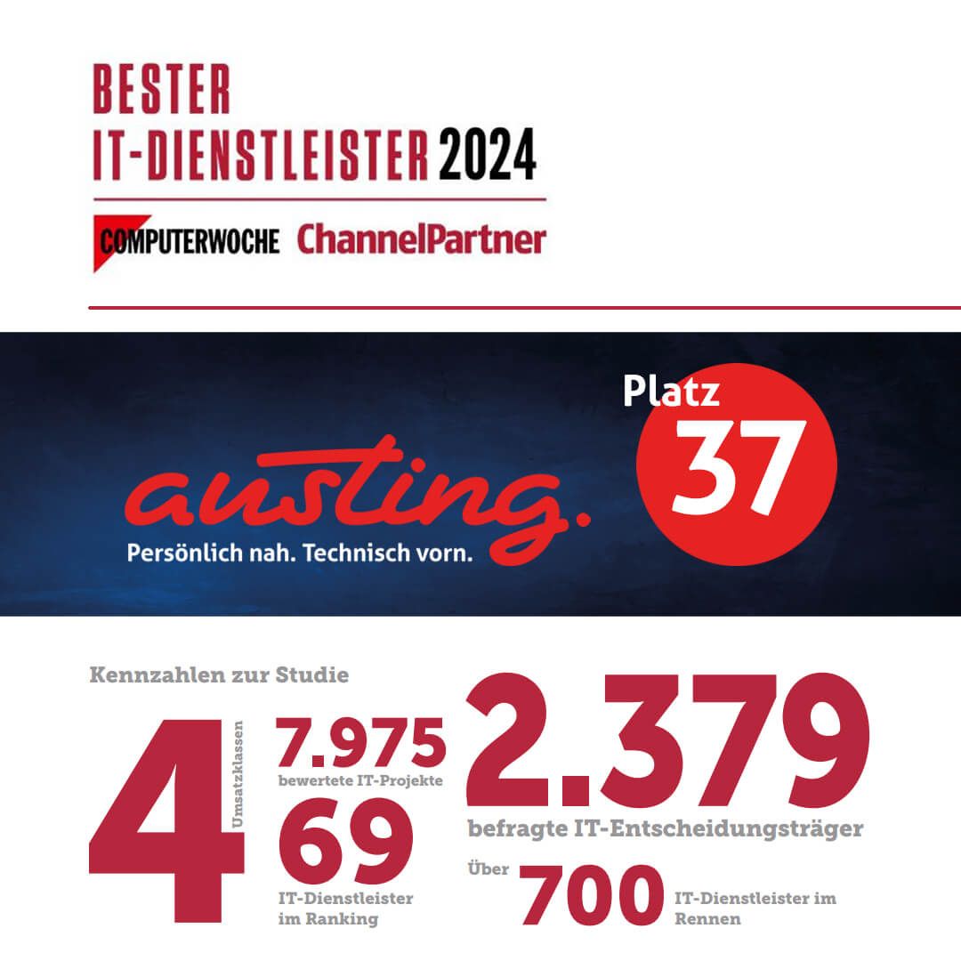 Die große Austing GmbH schafft es als einziger IT-Dienstleister im Oldenburger Münsterland und bundesweit unter 700 Unternehmen in das Ranking der "Besten IT-Dienstleister Deutschlands 2024" und belegt in ihrer Umsatzkategorie einen hervorragenden 37. Platz.